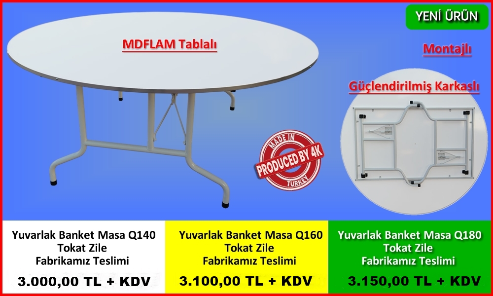 | PVC Çerçeveli Beyaz MDFLAM Tablalı | 3.000,00 TL + KDV | Alüminyum Çerçeveli Beyaz MDFLAM Tablalı | Fiyat Sorunuz. | | Yuvarlak Banket Masa Q160 cm | HAM MDF Tablalı | Fiyat Sorunuz. | PVC Çerçeveli Beyaz MDFLAM Tablalı | 3.100,00 TL + KDV | | Beyaz MDFLAM Tablalı | Fiyat Sorunuz. | | Yuvarlak Banket Masa Q180 cm | HAM MDF Tablalı | Fiyat Sorunuz. | PVC Çerçeveli Beyaz MDFLAM Tablalı | 3.150,00 TL + KDV | Alüminyum Çerçeveli Beyaz MDFLAM Tablalı | Fiyat Sorunuz. | İstoç Teslimi 10 Adet ve Üzeri | Yuvarlak Banket Masa Q140 cm | HAM MDF Tablalı | Fiyat Sorunuz. | PVC Çerçeveli Beyaz MDFLAM Tablalı | 3.250,00 TL + KDV | | Beyaz MDFLAM Tablalı | Fiyat Sorunuz. | | Yuvarlak Banket Masa Q160 cm | HAM MDF Tablalı | Fiyat Sorunuz. | PVC Çerçeveli Beyaz MDFLAM Tablalı | 3.350,00 TL + KDV | | Beyaz MDFLAM Tablalı | Fiyat Sorunuz. | | Yuvarlak Banket Masa Q180 cm | HAM MDF Tablalı | Fiyat Sorunuz. | PVC Çerçeveli Beyaz MDFLAM Tablalı | 3.400,00 TL + KDV | | Beyaz MDFLAM Tablalı | Fiyat Sorunuz. | İstoç Teslimi 1-9 Adet | Yuvarlak Banket Masa Q140 cm | HAM MDF Tablalı | Fiyat Sorunuz. | PVC Çerçeveli Beyaz MDFLAM Tablalı | Fiyat Sorunuz. | Alüminyum Çerçeveli Beyaz MDFLAM Tablalı | Fiyat Sorunuz. | | Yuvarlak Banket Masa Q160 cm | HAM MDF Tablalı | Fiyat Sorunuz. | PVC Çerçeveli Beyaz MDFLAM Tablalı | Fiyat Sorunuz. | | Beyaz MDFLAM Tablalı | Fiyat Sorunuz. | | Yuvarlak Banket Masa Q180 cm | HAM MDF Tablalı | Fiyat Sorunuz. | PVC Çerçeveli Beyaz MDFLAM Tablalı | Fiyat Sorunuz. | Alüminyum Çerçeveli Beyaz MDFLAM Tablalı | Fiyat Sorunuz. | - Fiyatlarımız Beyaz ve Bej Mdf-Lam Renkleri için Geçerlidir. Ahşap Desenli Mdf-Lam Renklerinde Fiyat Farkı Uygulanır. - Fiyatlarımız Siyah, Gri ve Bej Metal Renkleri için Geçerlidir. Metalik Renklerde Fiyat Farkı Uygulanır. | |